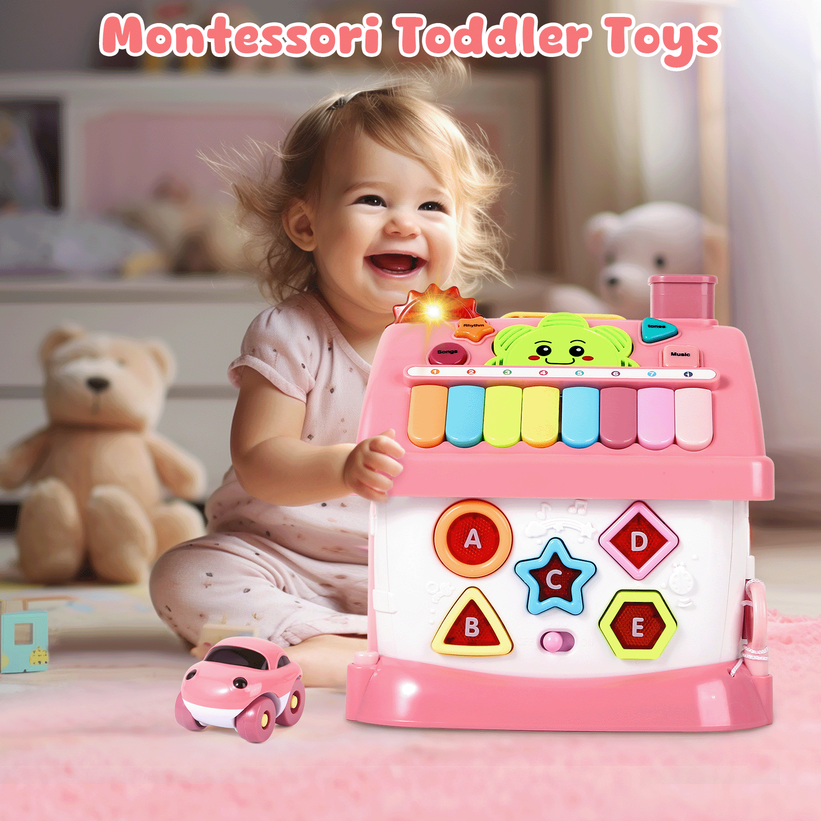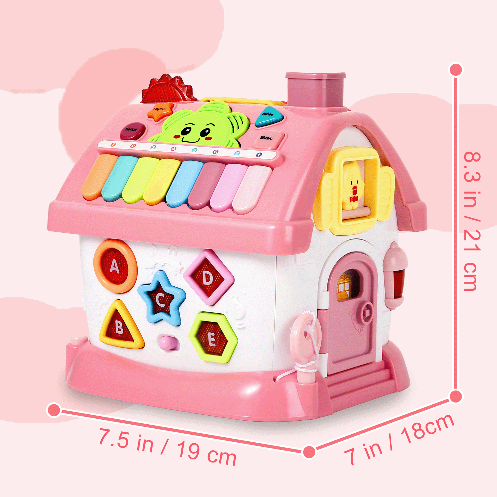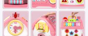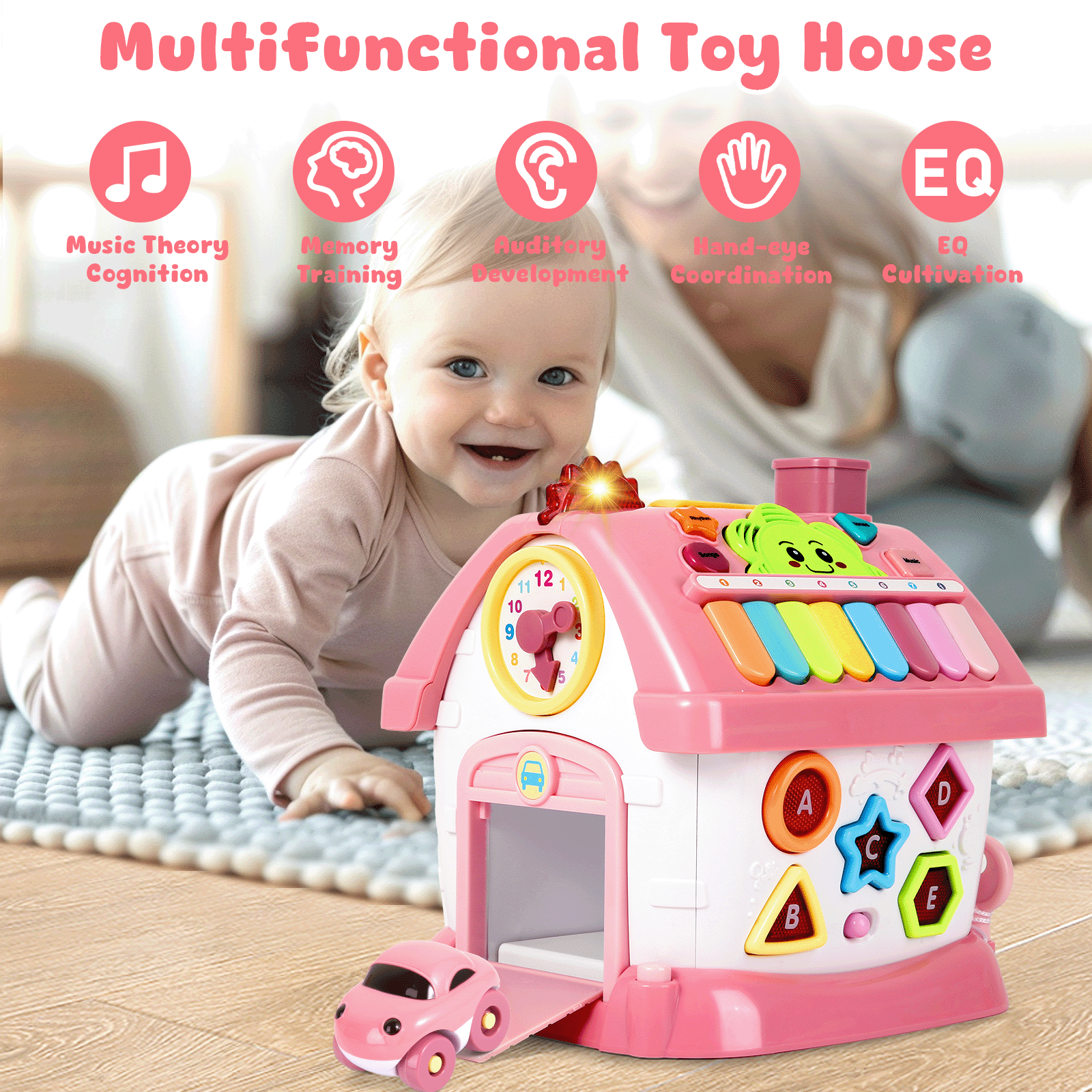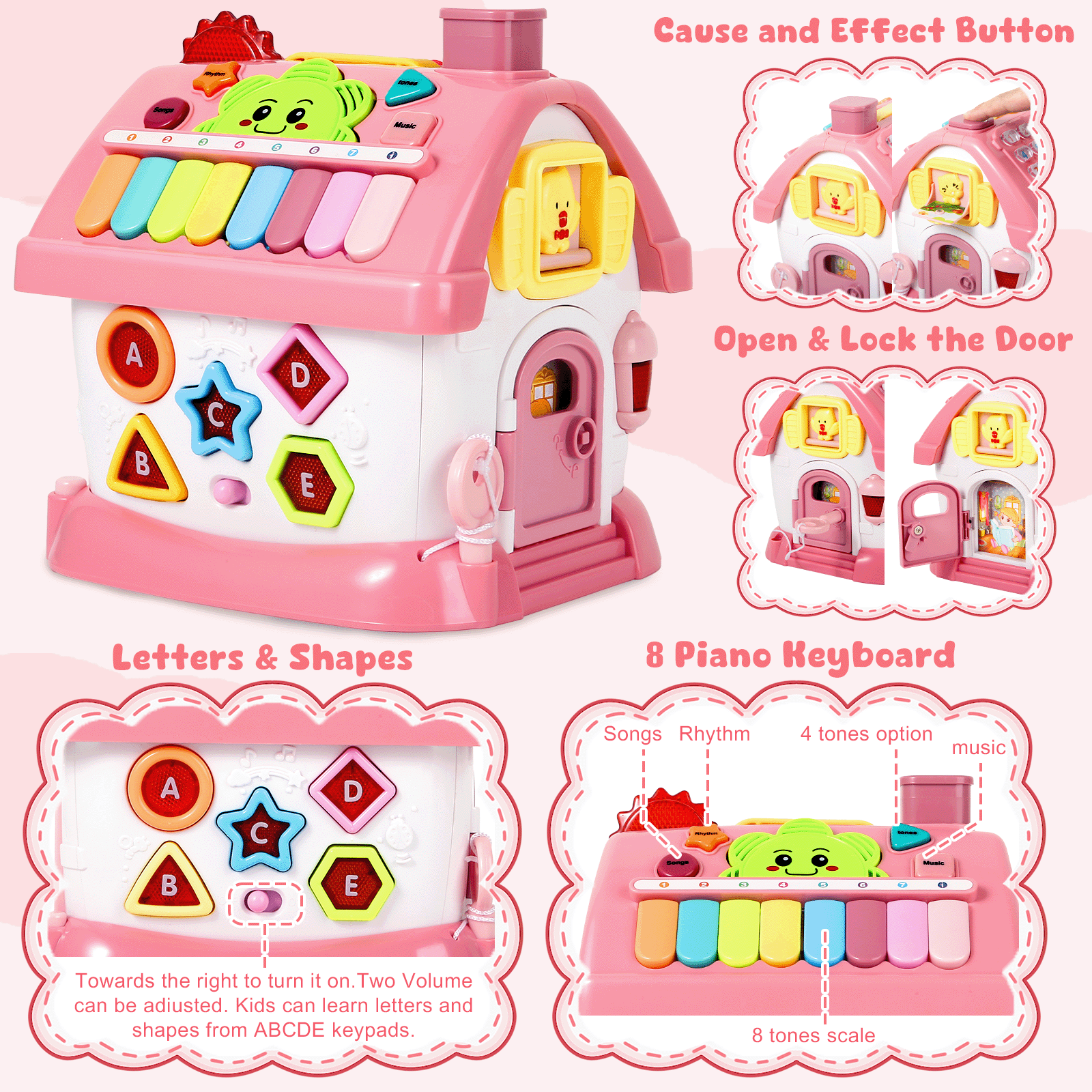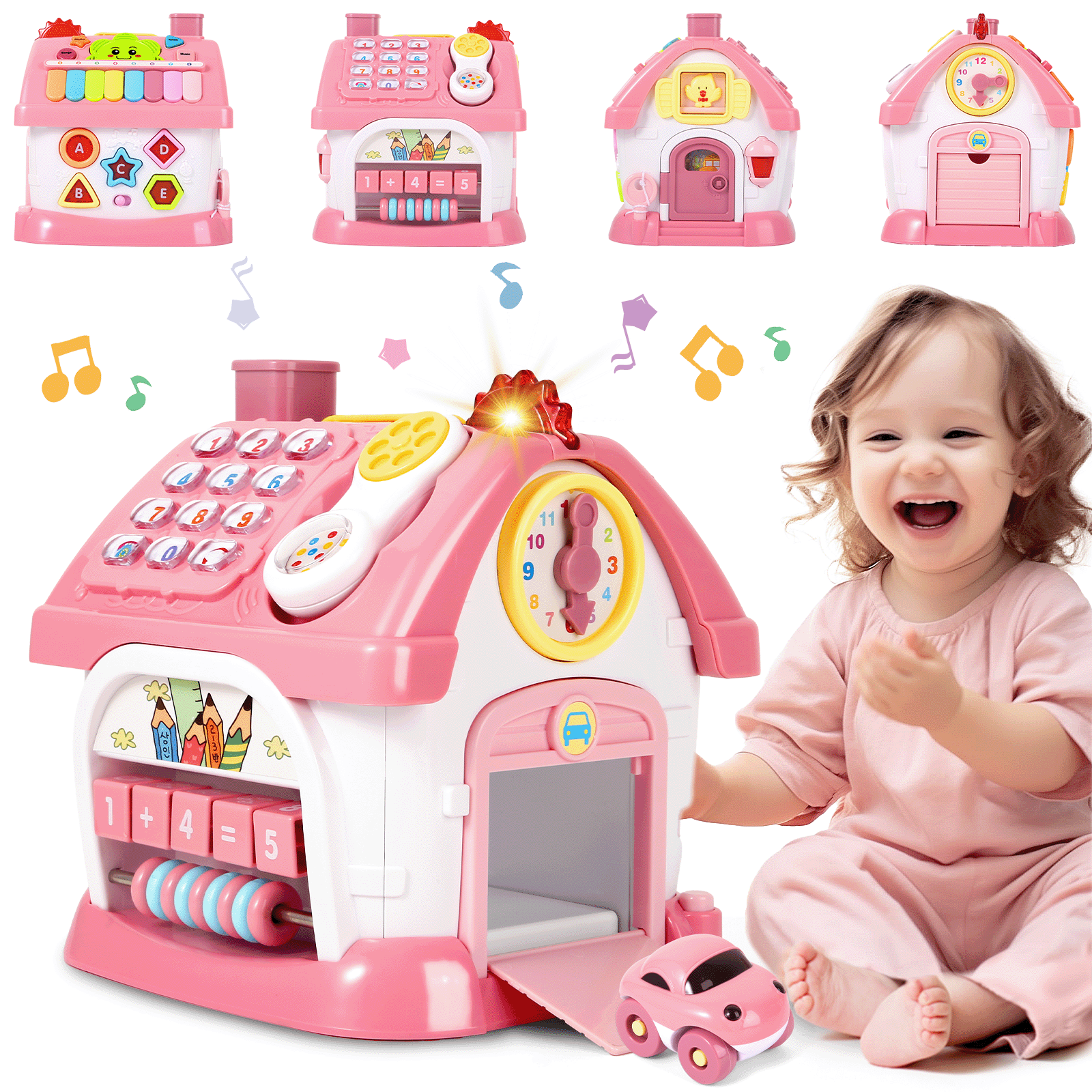 - Multifunctional House Toy: The fun hexagonal house is designed according to the nature of the baby, each side is a new toy for kids to enjoy playing: music zone with 8 keyboard, adjusted clock, fun animal window, drive the car out, mathematics pattern, shape & letters pattern, unlocking design