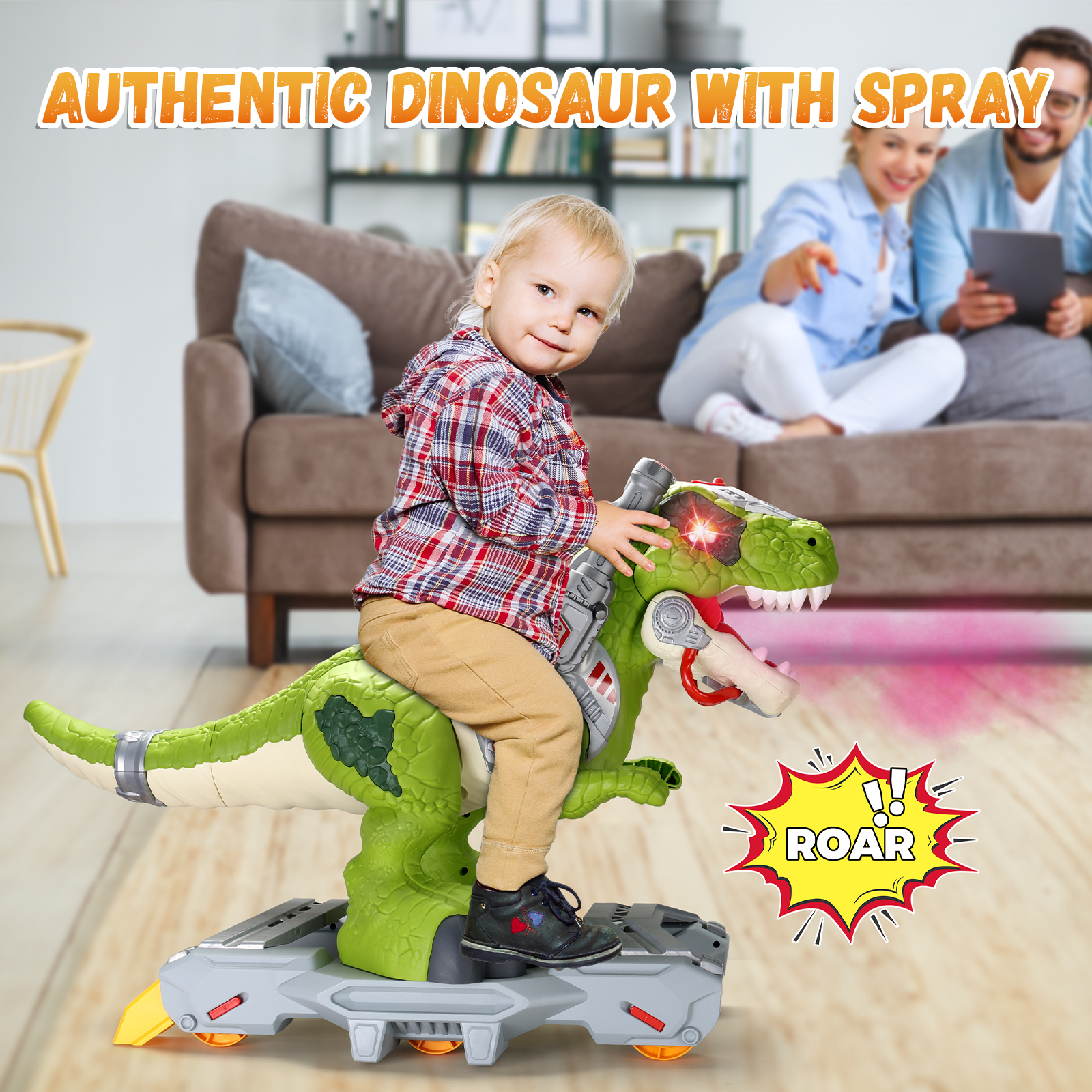 • Our ride on toy features a mist spray function. Simply add water and pull the lever to see the dinosaur open its mouth, releasing cool mist with glowing eyes for a thrilling and realistic effect