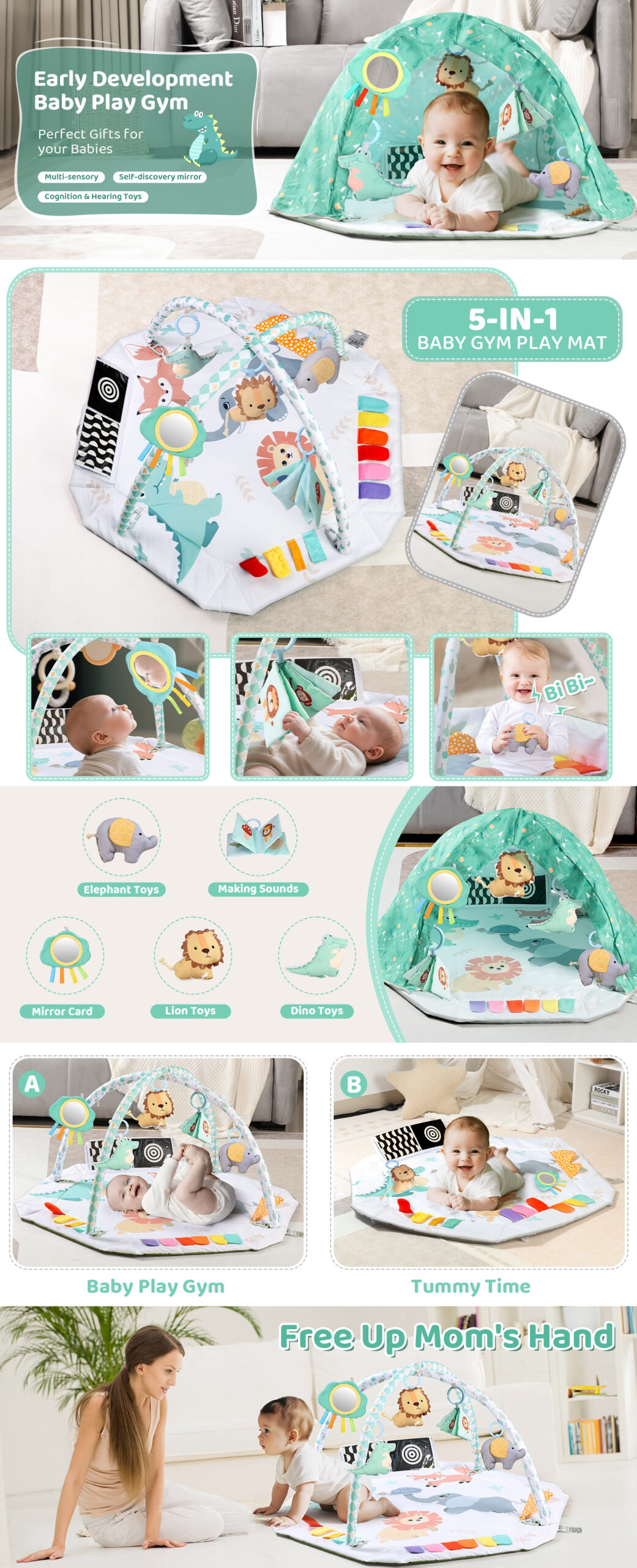- Our baby activity gym sets offers full early development, featuring color recognition, high-contrast images, varied textures, and mirror cards. It stimulates toddlers’ vision, hearing, touch, cognitive, and physical coordination. Free up hands for busy mom