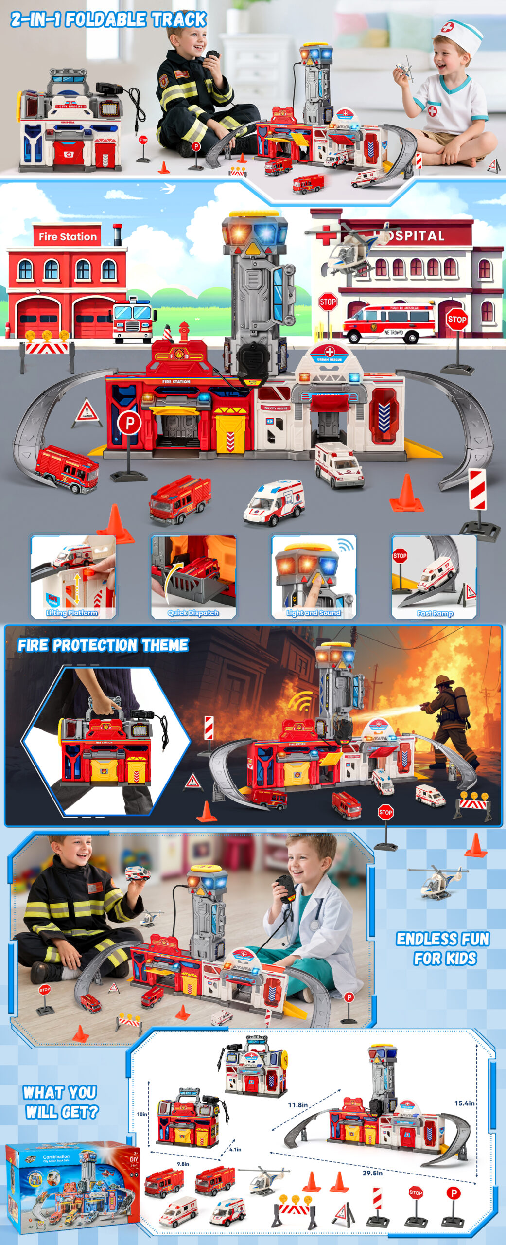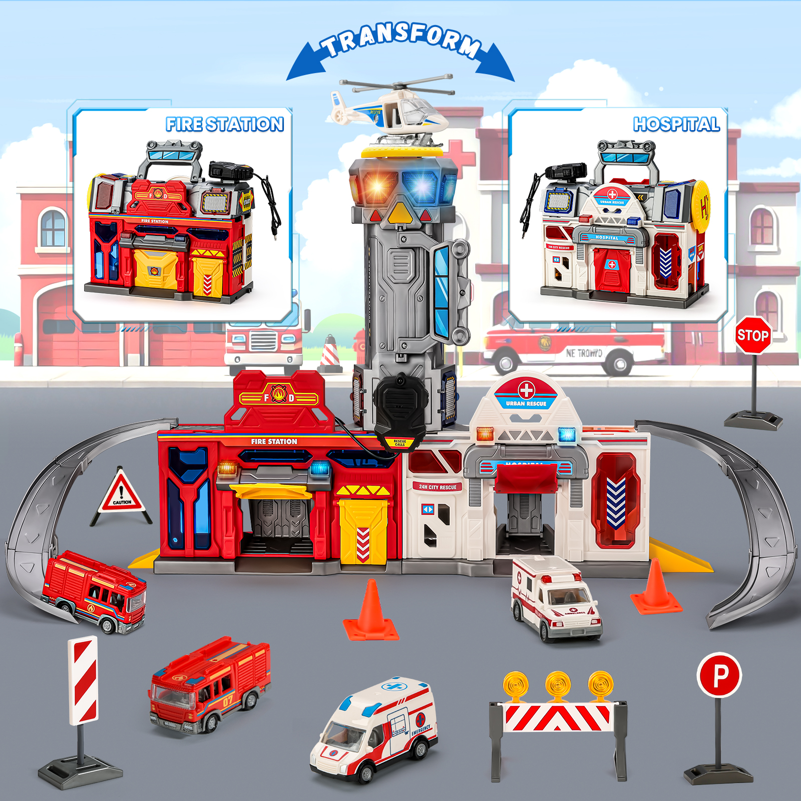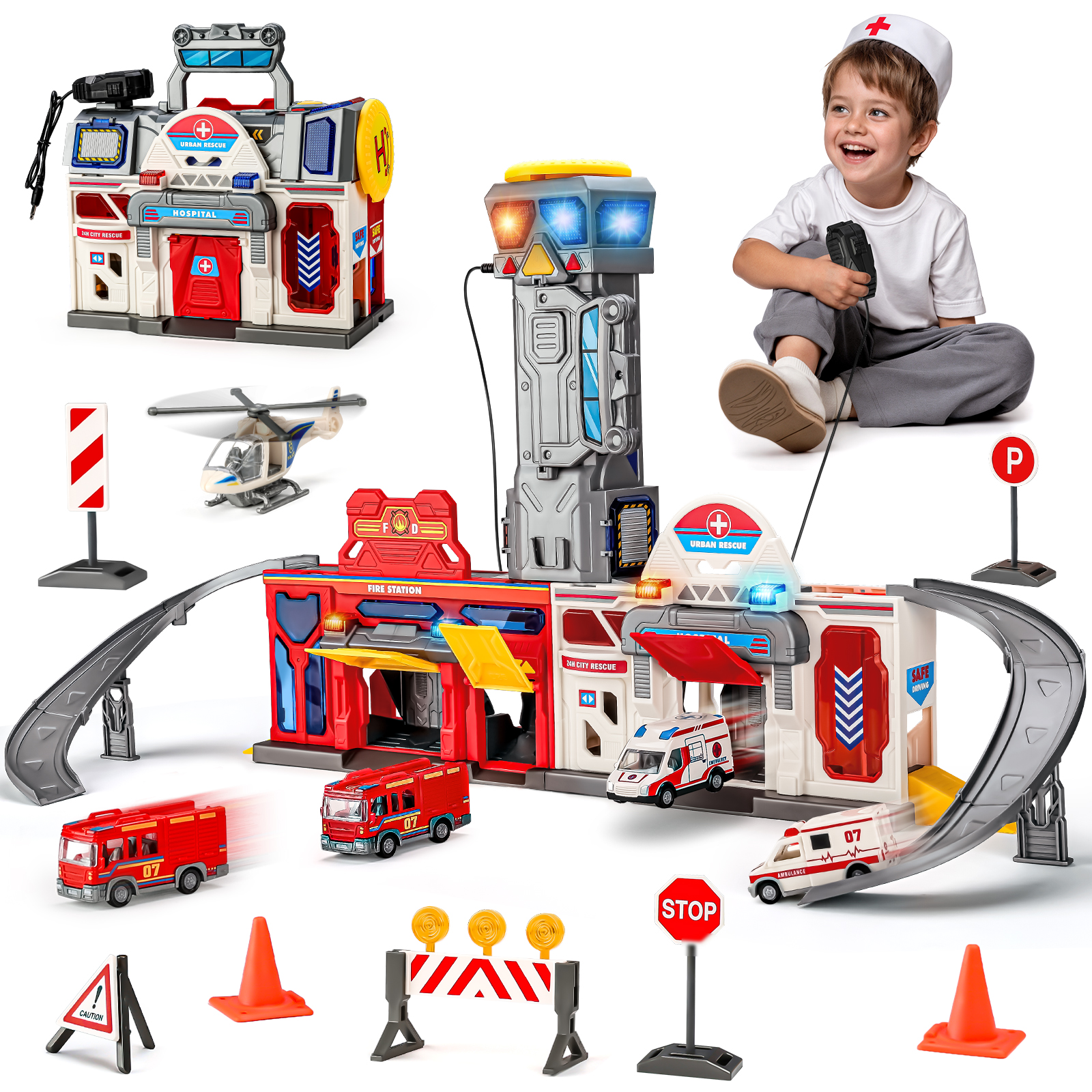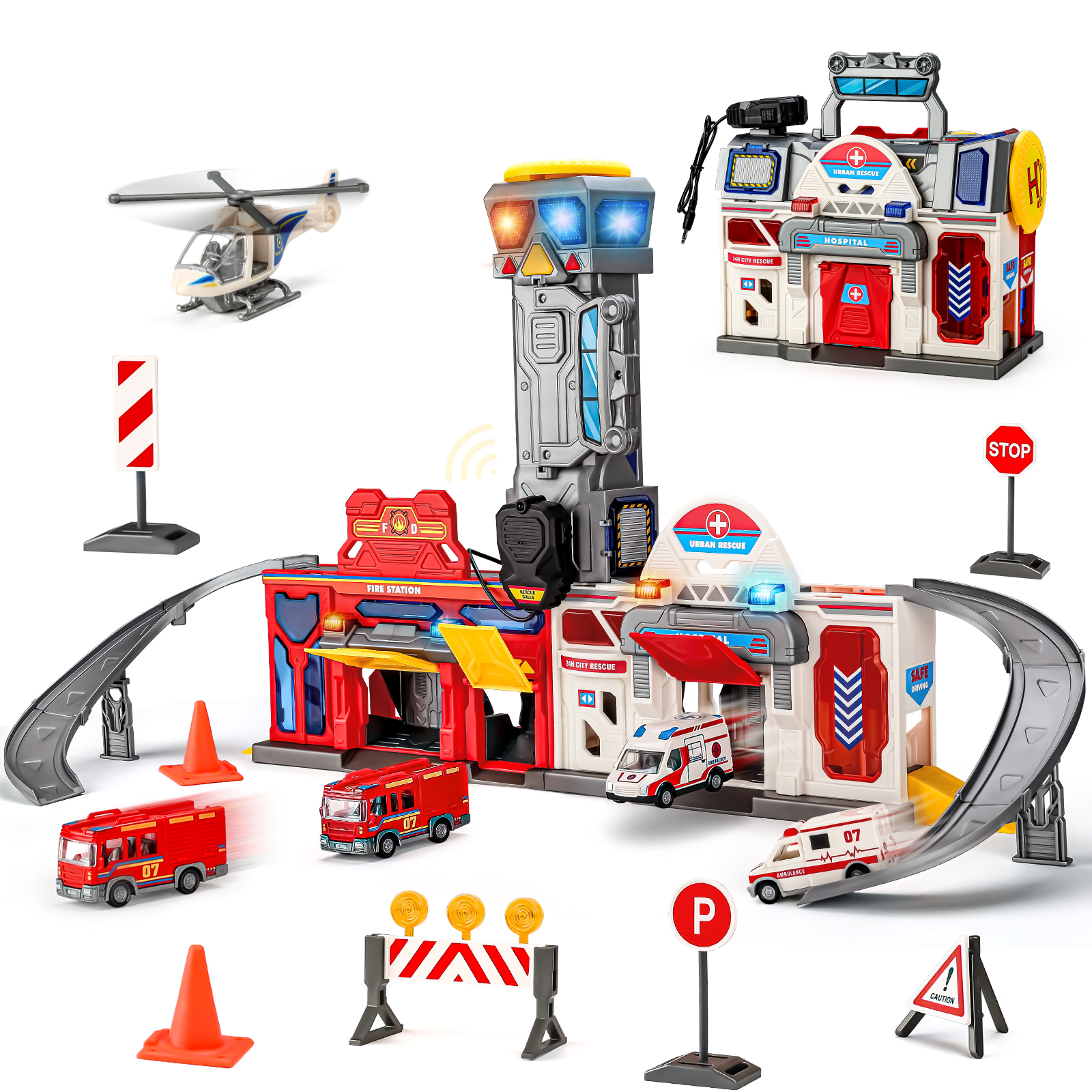 - 【Super Value Pack】The car track set can transform into a fire & hospital station, complete with accessories such as an elevator, tracks, garages, a watchtower, a helicopter landing pad, 2 rescue trucks, 2 fire trucks, a rescue helicopter & multiple traffic sign models. It features realistic lights, sound effects & walkie-talkies, keeping kids entertained for hours