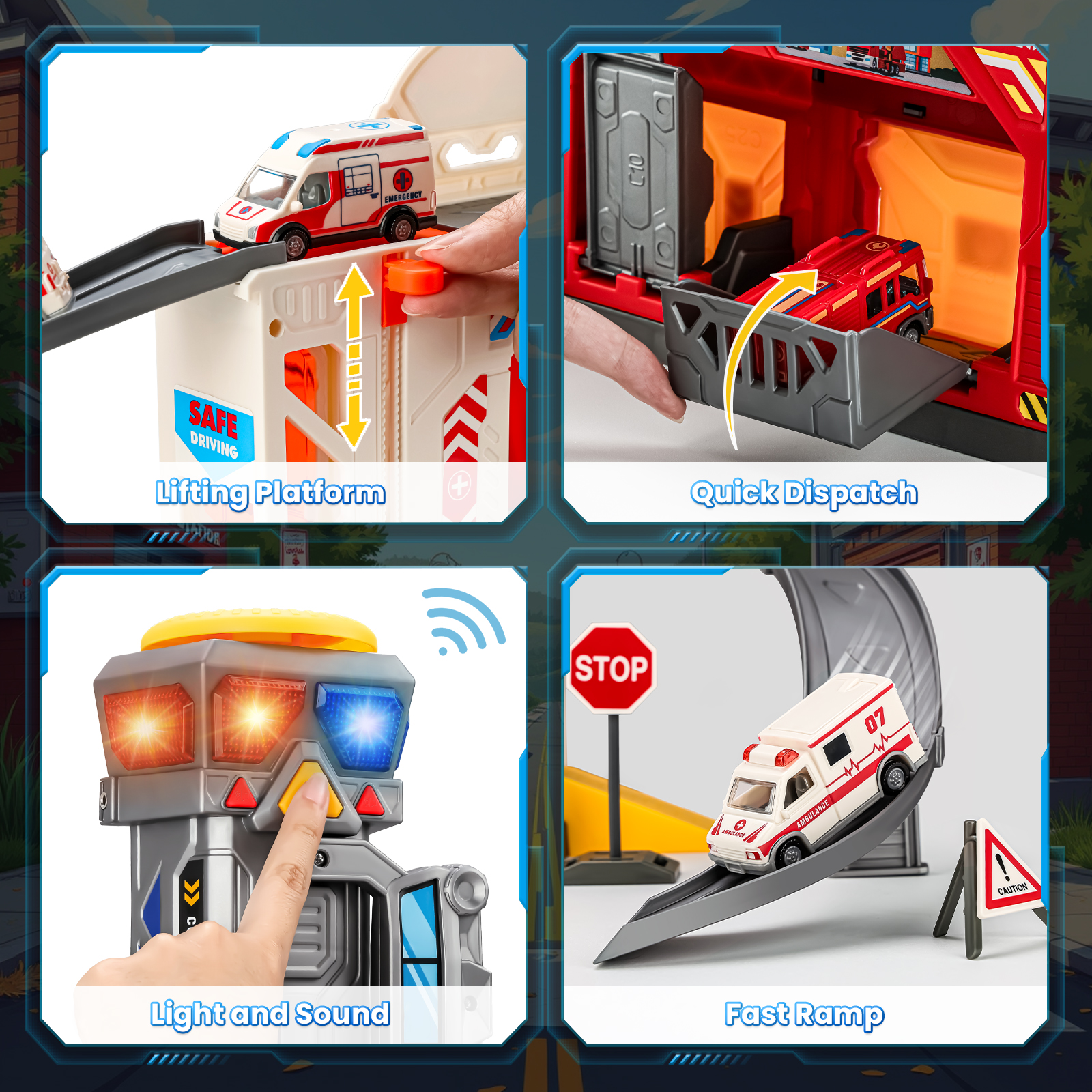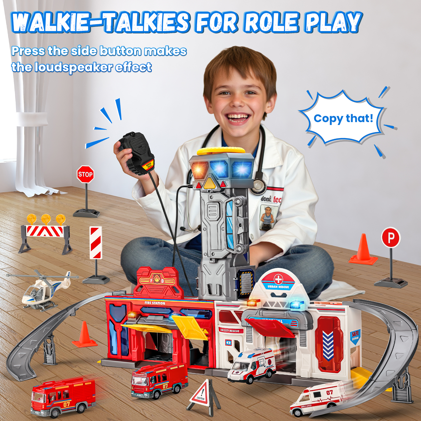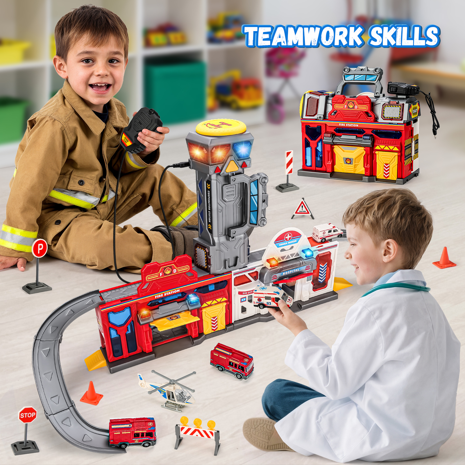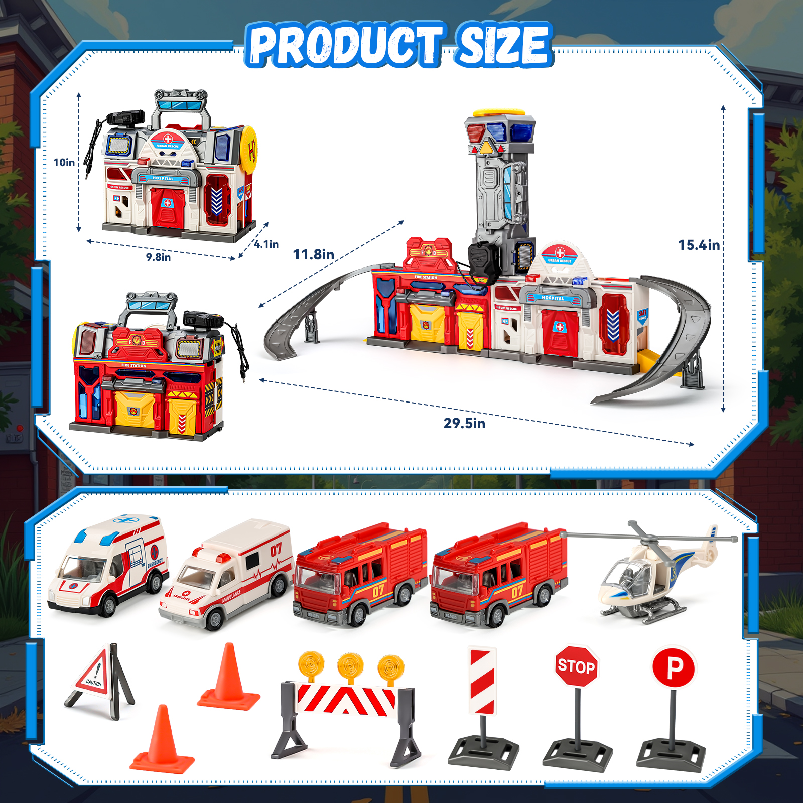 - 【Super Value Pack】The car track set can transform into a fire & hospital station, complete with accessories such as an elevator, tracks, garages, a watchtower, a helicopter landing pad, 2 rescue trucks, 2 fire trucks, a rescue helicopter & multiple traffic sign models. It features realistic lights, sound effects & walkie-talkies, keeping kids entertained for hours