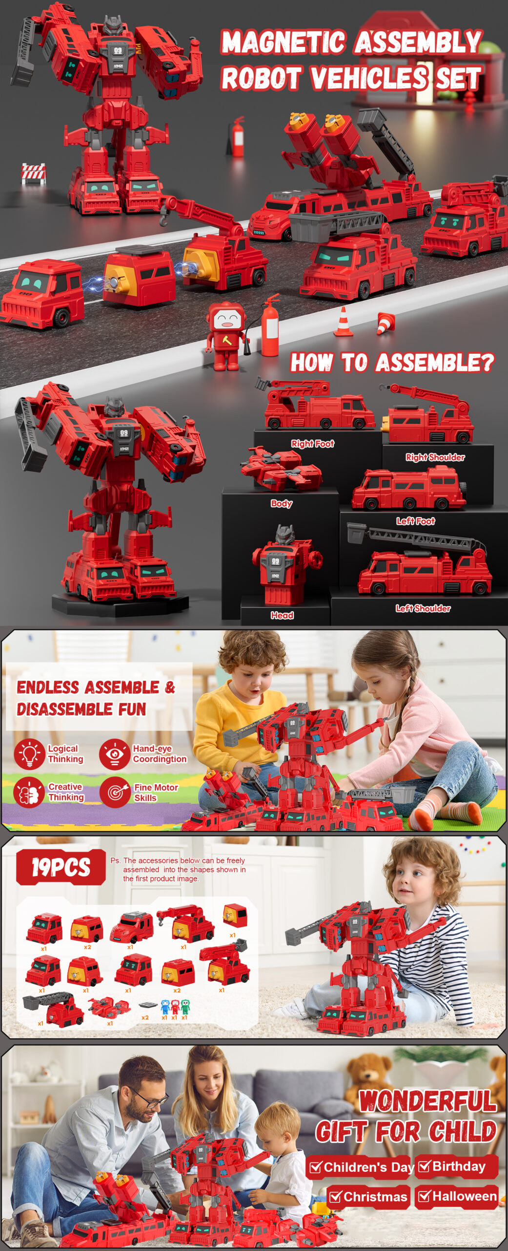 - No batteries needed! Our 19PCS magnetic transformation fire truck car set easily take apart and reassembles, allowing kids to switch between cars and robot modes for endless fun