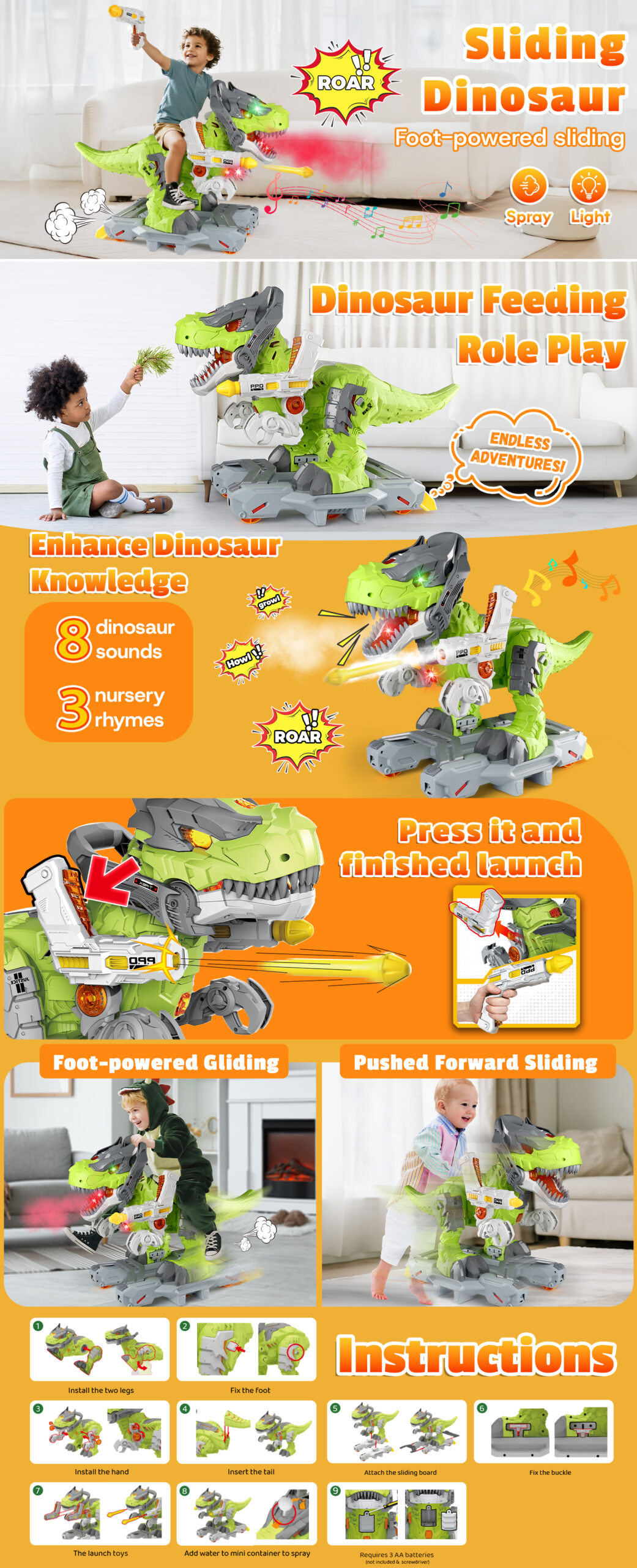 - Our dinosaur ride on toy car offers multifunctional fun! Kids can ride, enjoy lights, music, roaring sounds, and press buttons to hear 3 nursery rhymes and 8 dinosaur sounds, immersing children in the world of dinosaurs and feeling the majesty of the prehistoric giant