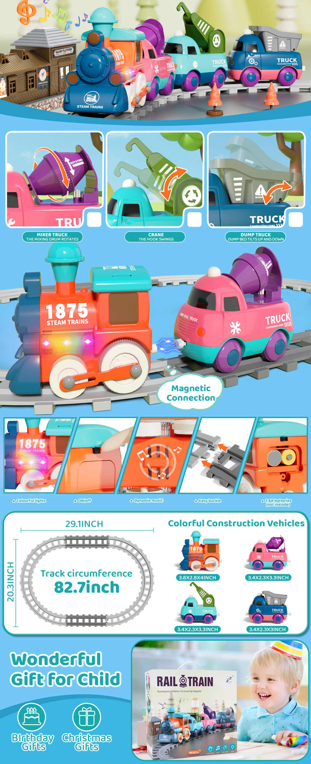 - Our toddler train toy sets can inspire creativity and imagination! Our toy set include mixer truck, dump truck, and crane, these trucks will spin as the front truck moves. It can spark kids curiosity and imagination, while also fostering the development of coherent thinking, hand-eye coordination and fine motor skills